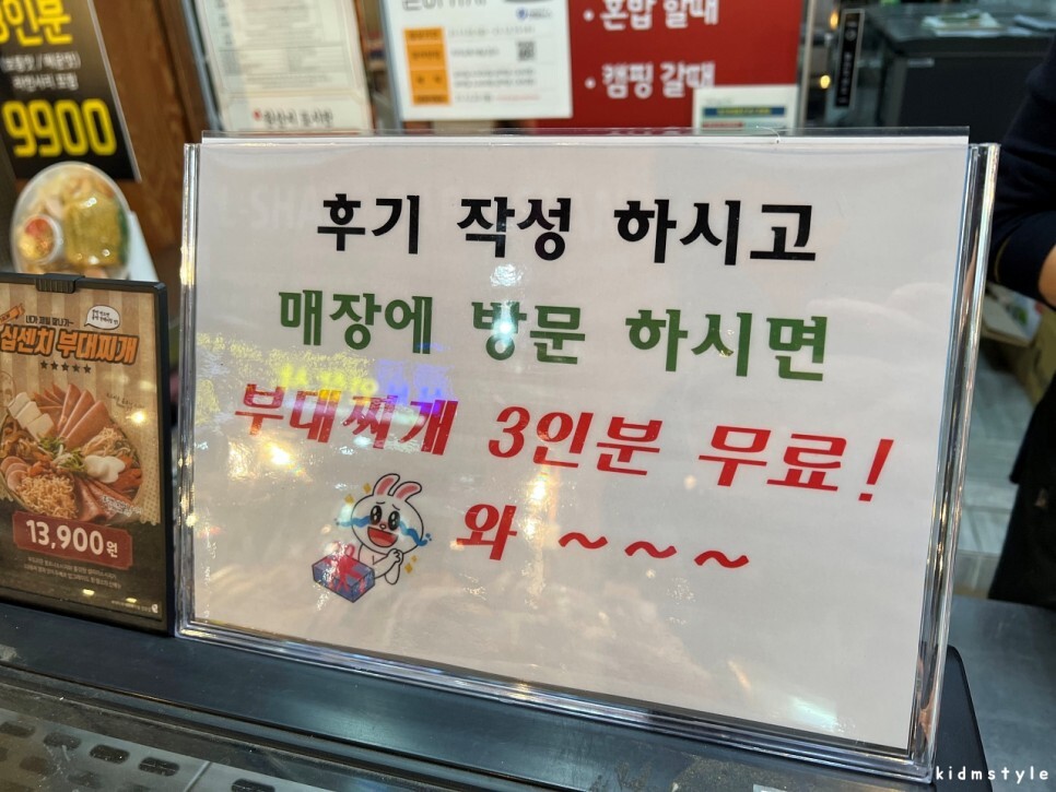 블로그 포스팅 등 후기를 작성하면 부대찌개 3인분이 무료라고 한다. 참고하기 바란다.