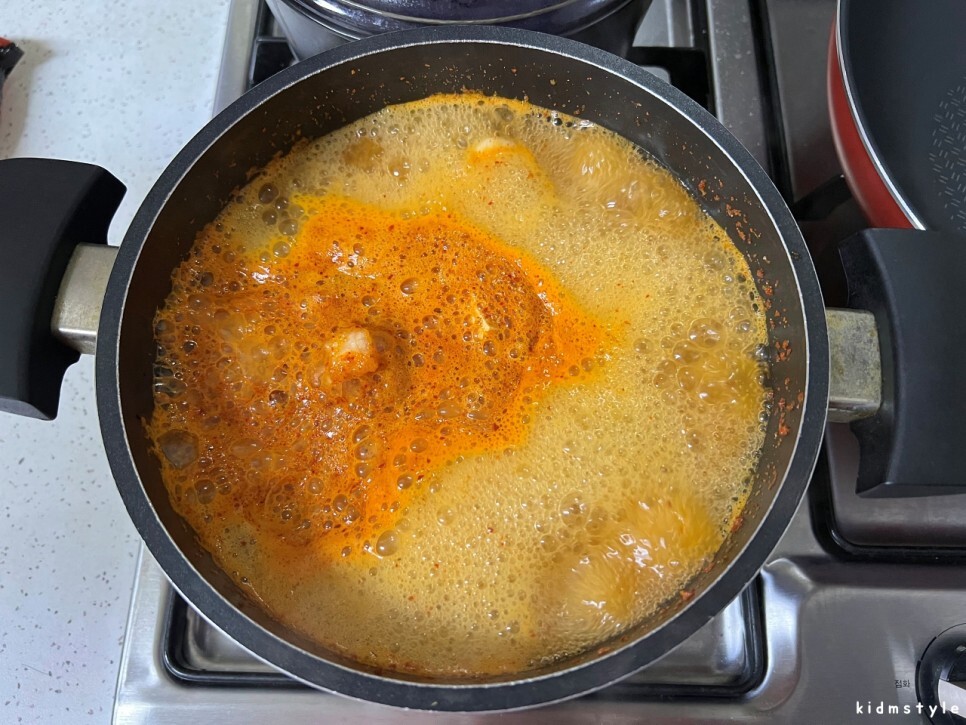팔팔 끓으면 라면과 떡을 넣고 더 끓여준다. 맛있는 냄새가 집안에 진동을 하는구나.