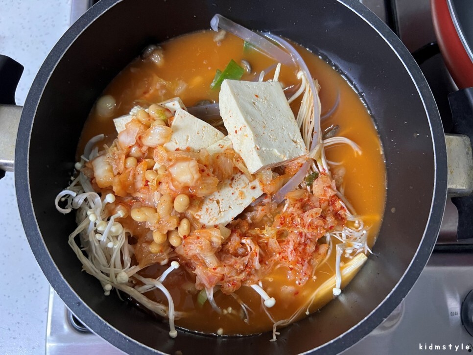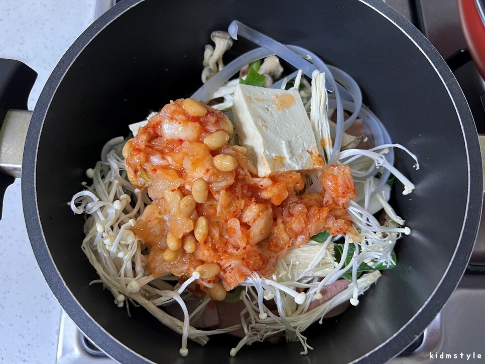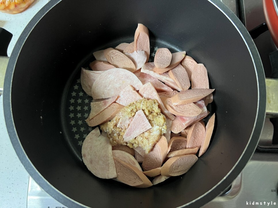 큰 냄비를 꺼내서 가스레인지에 올리고 재료를 하나하나 넣어본다. 소시지, 햄과 민찌부터 넣고