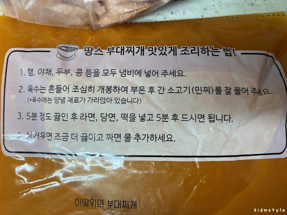부대찌개 하면 생각나는 그 맛이다. 저렴한 가격에 익숙한 맛을 제공하니 가끔 생각나서 구입하게 되더라. 하나하나 재료를 구입해서 만들어 먹어도 좋지만 간편하게 먹기에는 이만한 게 또 있나 싶다. 9900원짜리 한 봉지를 구입해서 라면사리 반개씩 넣어먹으면 성인 남자 기준으로 3끼가 해결된다. 가성비가 정말 좋다. 한 번 사 먹어보는 것을 추천한다. 소주 한잔하기도 참 좋다.