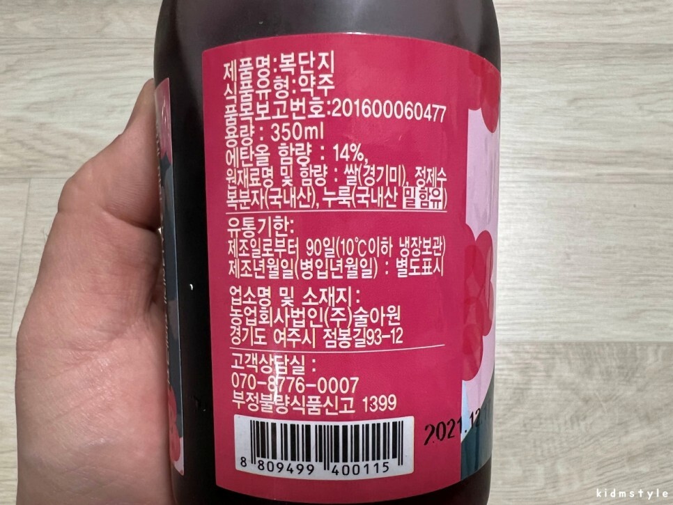국내산 복분자와 경기도 여주산 찹쌀, 누룩, 그리고 물을 재료로 발효 중인 술에 증류주를 넣어 재차 발효숙성을 시켜 완성한다. 특히 다른 지역 찹쌀보다 비싼 여주산 찹쌀을 고집하는 이유는 여주산 찹쌀로 만들어야 특유의 달콤하고 부드러운 맛이 살아나기 때문이라고 한다. 판매처의 설명을 가지고 와봤다.