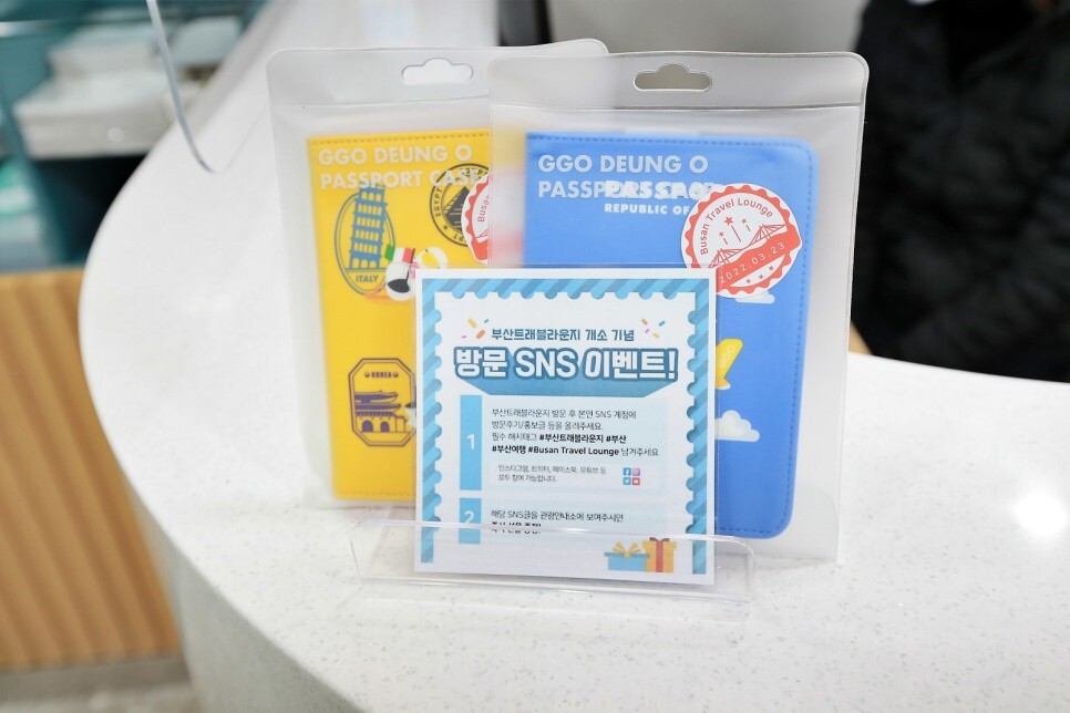 부산 트래블 라운지 개소 기념 방문 sns 이벤트도 진행하고 있습니다. 선착순으로 여권 케이스를 증정하니 한번 들러보세요. 여권 케이스가 꽤 귀엽네요.