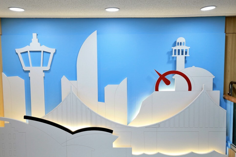 2층에서 바라본 벽에는 용두산공원 부산타워, 자갈치시장, 광안대교, 태종대 등대 등 부산을 상징하는 다양한 관광지의 모습이 간결하게 그려져 있습니다.