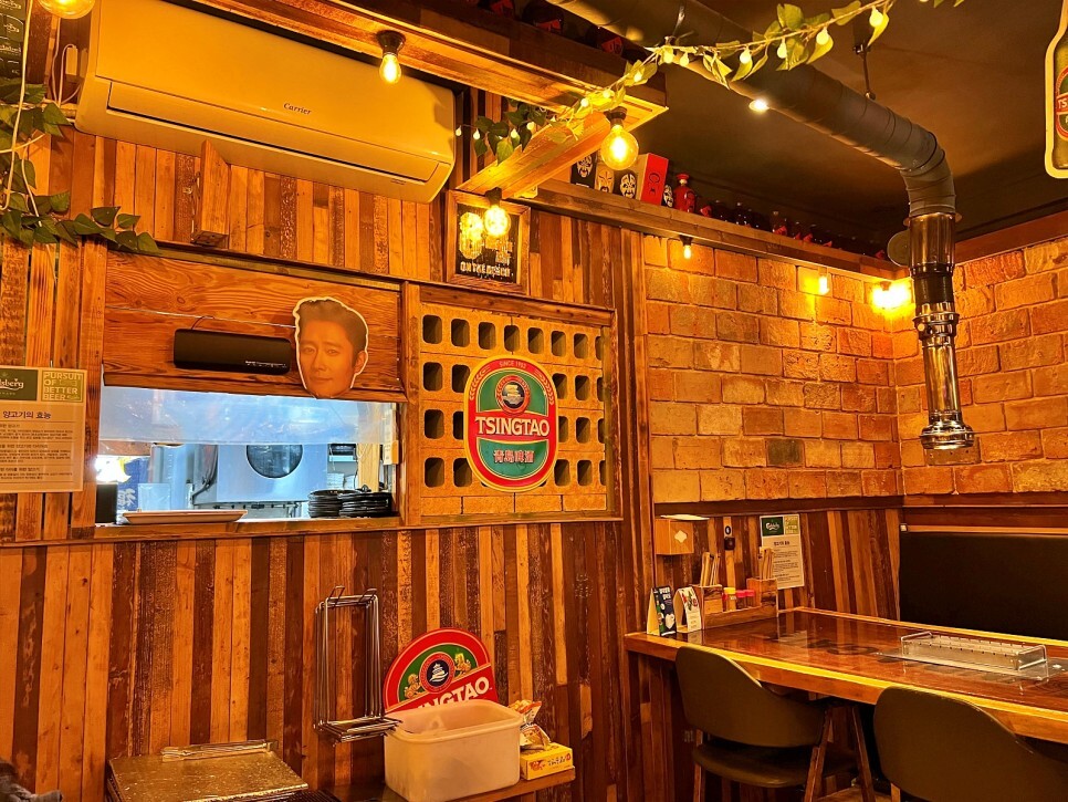 차분한 조명이 은은하게 깔려서 음식을 즐기기에 좋은 분위기입니다. 주방 쪽에 배우 이병헌의 얼굴이 재미있네요.