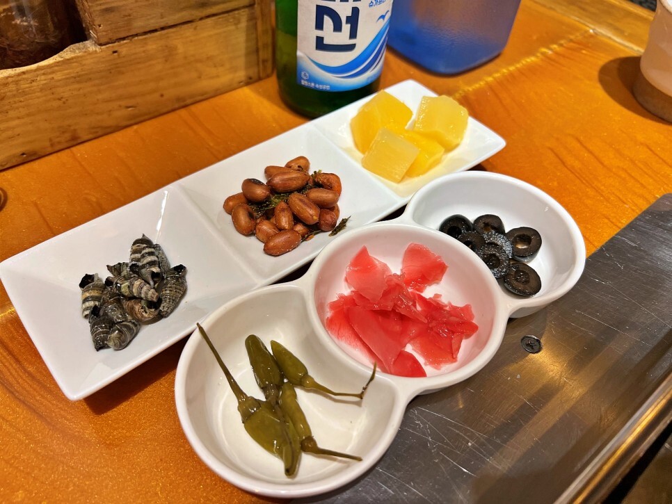 기본 반찬은 5가지인데 갯고동과 올리브가 인상적이네요. 둘 다 엄청 좋아하는 것들이라 기분이 좋습니다. 특히 갯고동은 2번이나 리필해서 먹었네요.