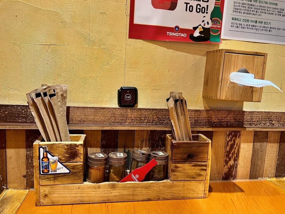 젓가락은 개별로 포장되어 있습니다. 먼지도 막아주고 위생적으로 좋네요. 쯔란, 고춧가루, 강황가루, 소금 등 기본양념이 놓여있어서 취향껏 뿌려 먹으면 됩니다.