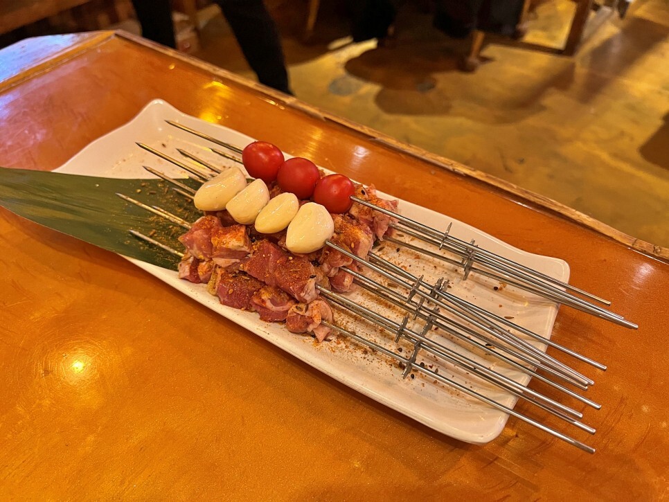 양꼬치는 1인분이 먼저 나옵니다. 주문과 동시에 꼬치를 만드는 걸로 보입니다. 양념이 잘 배여있어서 구우면 참 맛있을 것 같네요.
