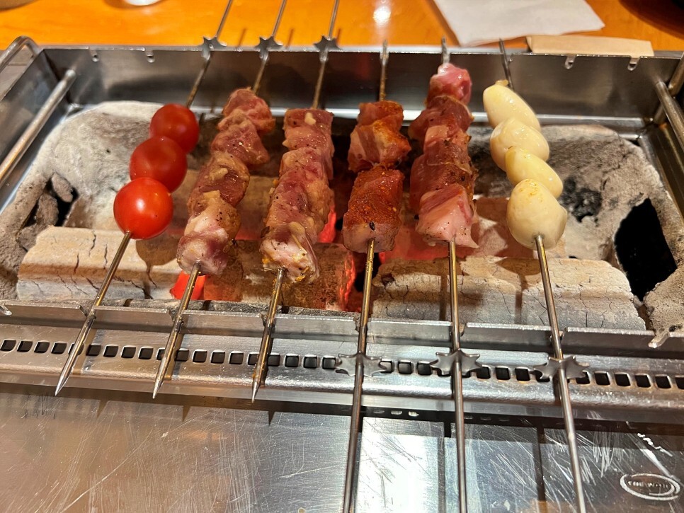 잘 달궈진 불 위에 양꼬치, 방울토마토, 마늘 등 다양하게 올려봅니다.