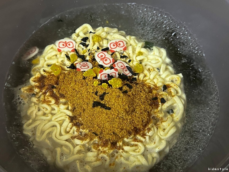 후레이크도 넣고 열심히 끓인다. 너구리 모양의 고명이 귀엽다.