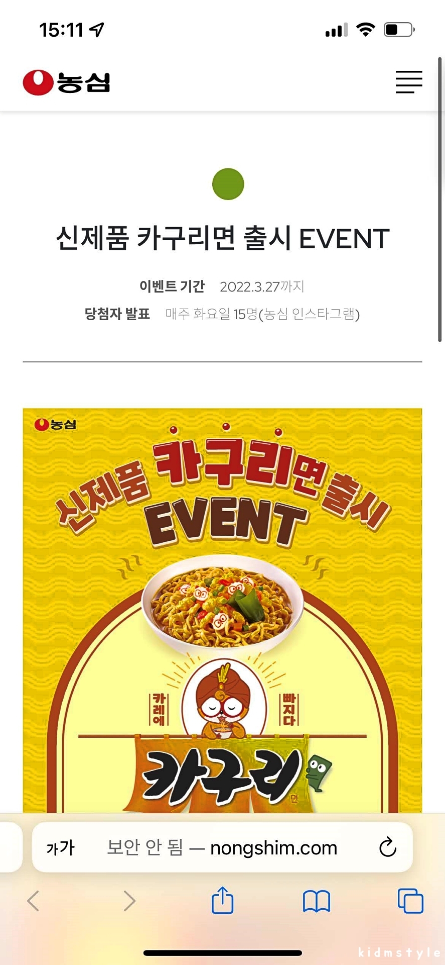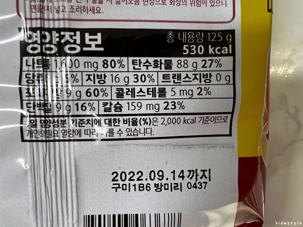 '인생을 맛있게' 농심에서 만든 '카레에 빠지다' 카구리면이다. 카구리 컵라면이 먼저 편의점에 풀리더니 최근 대형마트에 봉지라면이 보이기 시작하더라. 4봉지 한 팩에 4,580원이다. 한 봉지에 1,145원꼴. 기존의 너구리가 5봉지 한 팩에 4,080원, 1봉지에 816원인 것에 비하면 가격은 조금 비싼 편이다.