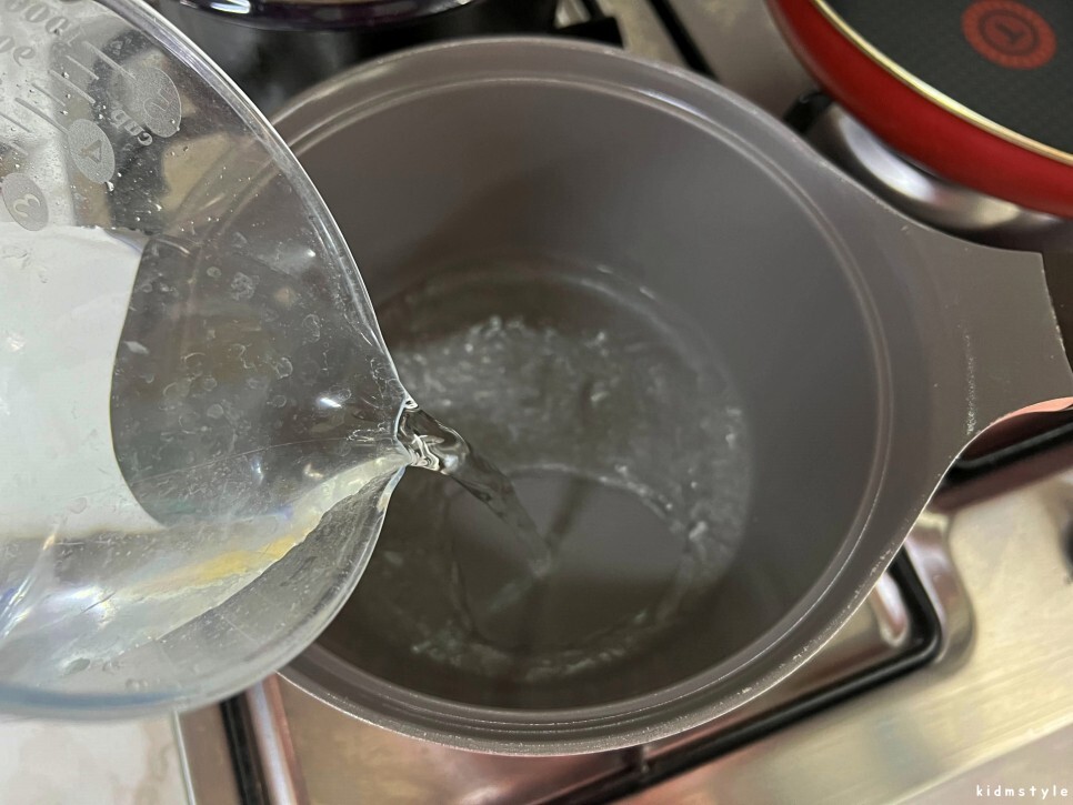 정수기에서 물 450ml를 계량컵에 받고 냄비에 붓고 끓여준다. 참고로 이런 계량컵 하나 있으면 아주 편하다. 다이소에서 저렴하게 구입 가능하다.