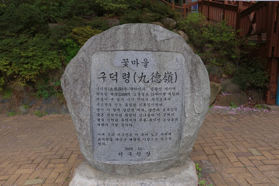 구덕령은 구덕산과 엄광산 사이에 위치한 해발 226m의 고갯길로 19세기 말 개항과 더불어 새 길이 나기 전까지 부산포에서 구포장을 잇는 유일한 지름길이었다. 당시 이 땅에 살았던 어부, 장꾼과 보부상은 물론 전란시의 의병이 넘나들며 이곳에서 땀을 식히고 주막에서 목을 축이던 조상들의 애환이 서린 곳이다. 이에 우리 서구민은 이 유서 깊은 자리에 표지석을 세우고 애향의 터전으로 삼고자 한다.