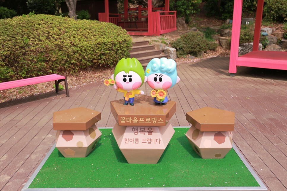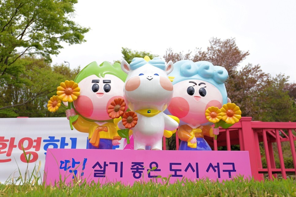 꽃마을 이곳저곳을 둘러봅니다. 귀여운 친구들이 반갑게 맞이하네요. 부산 서구의 마스코트 덕이와 송이, 그리고 천마니입니다. 딱! 살기 좋은 도시 서구~ 맞아요. 서구 살기 좋습니다.