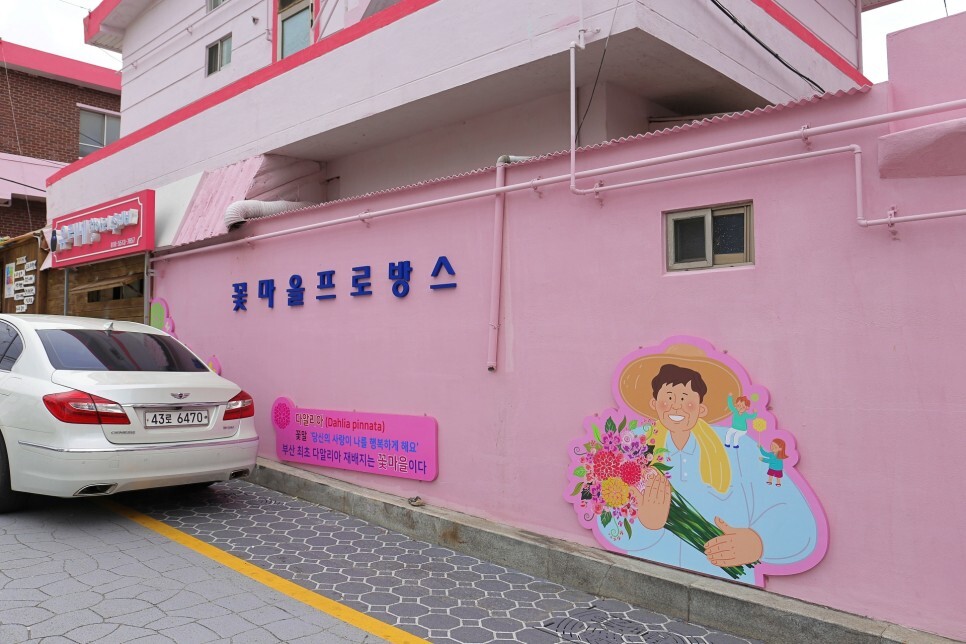 천마니, 덕이, 송이가 있는 쪽에서 바라본 꽃마을의 풍경입니다. 꽃마을 프로방스라는 도시 재생사업을 통해 아주 예쁘게 탈바꿈한 모습이 인상적입니다. 분홍색 파스텔 톤으로 예쁘게 색칠한 외벽은 미소를 짓기에 충분합니다.