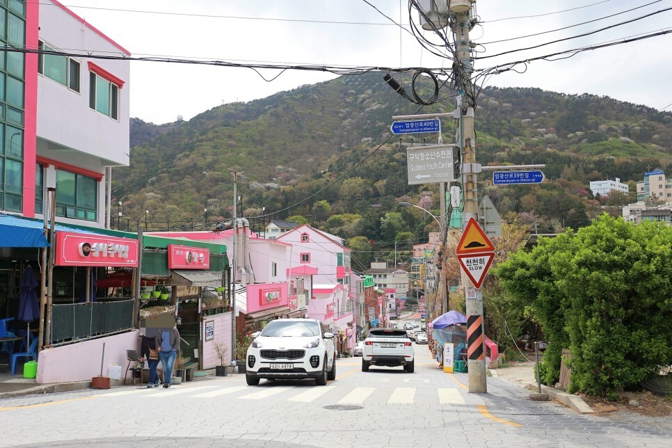 이곳, 꽃마을은 지대가 높은 곳에 있는 마을입니다. 그래서 오르는 길의 경사가 제법 있어요. '꽃마을로'는 겨울에 부산에 눈이 오면 금정구의 '산성로'와 함께 부산에서 가장 먼저 도로 통제가 되는 길 중에 하나입니다.