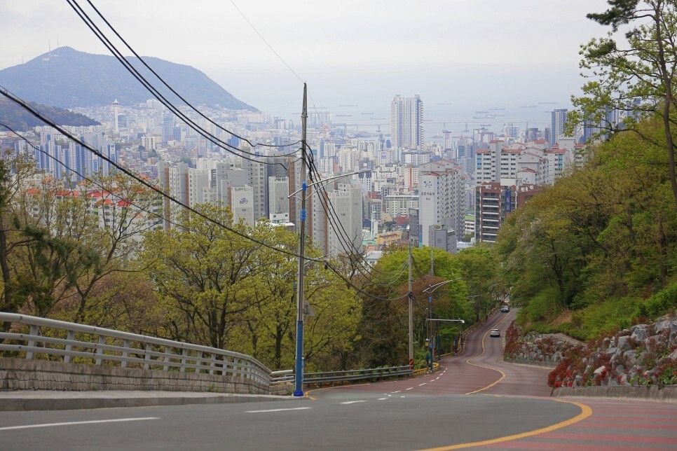 내려가다가 잠시 정차를 하고 찍어봅니다. 고개가 꽤 높죠? 서구의 전경이 그대로 보입니다. 그리고 저 멀리 영도, 용두산공원 부산다아이몬드타워, 남항대교, 그리고 남항 묘박지에 정박한 배들까지 일상의 여유가 그대로 느껴집니다. 가끔 답답할 때 이곳에서 바라보는 부산의 일상은 힐링을 하기에 충분합니다.