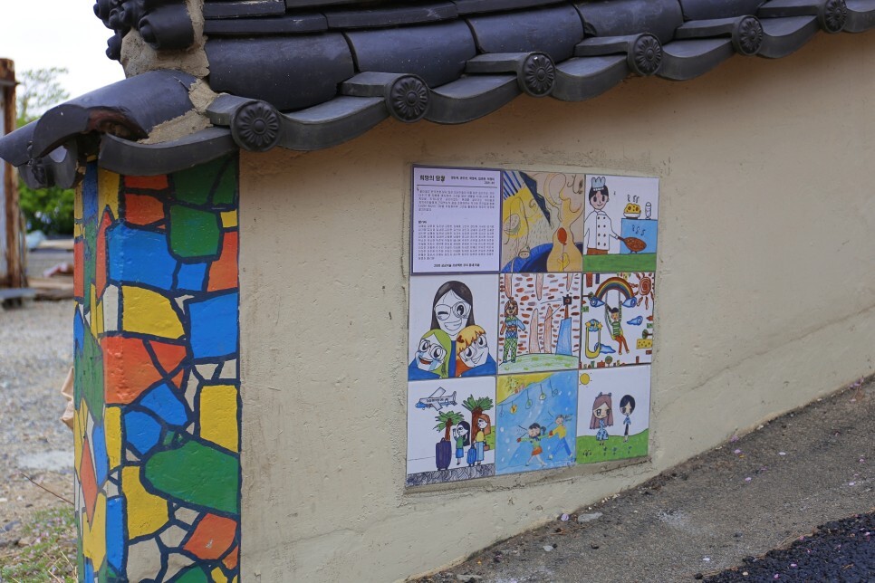 오르는 어느 담벼락을 보니 학생들의 작품이 벽화처럼 멋지게 꾸며져 있습니다.