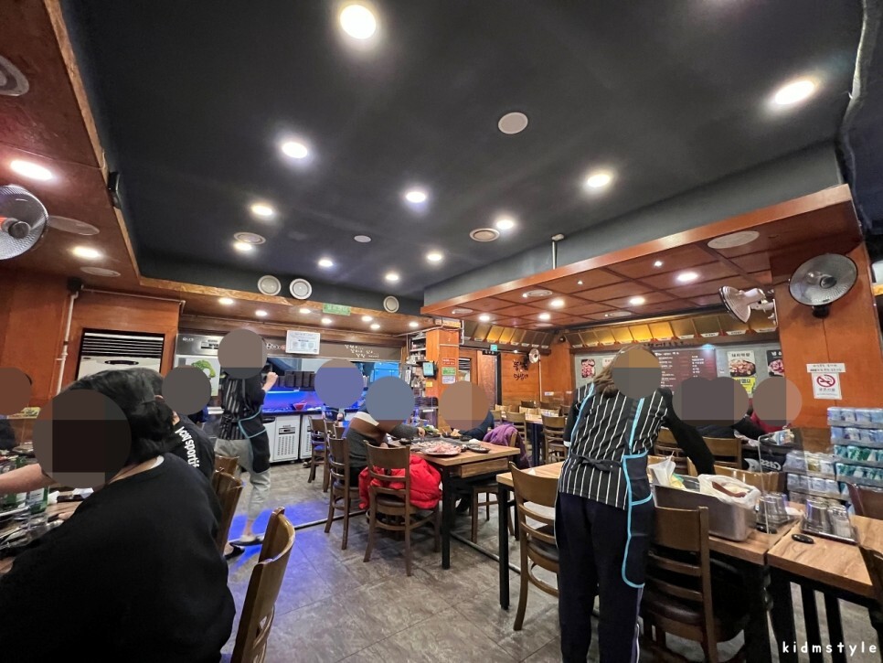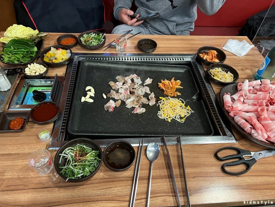 불판이 상당히 넓어서 좋다. 김치와 콩나물을 올리고 고기를 올려도 불판이 남아돈다. 술은 브랜든 취향인 진로로 주문했다. 물론 나는 대선파. 어느 모임에 가니까 각자 소주 취향이 달라서 본인이 마시고 싶은 소주를 주문해서 각자 1병씩 놔두고 마시고 마지막 병은 가위바위보로 정해서 주문하더라. 다른 모임에서는 약속 장소에 가장 먼저 도착한 사람이 소주, 맥주 선택권을 가지기도 하더라. 재미있다.