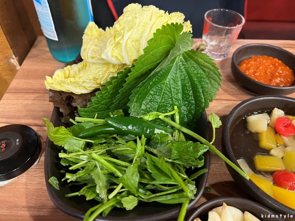 셀프 코너가 상당히 잘되어 있다. 심지어 미나리가 무료 제공이다. 몇 g에 얼마에 파는 집하고는 다르다.