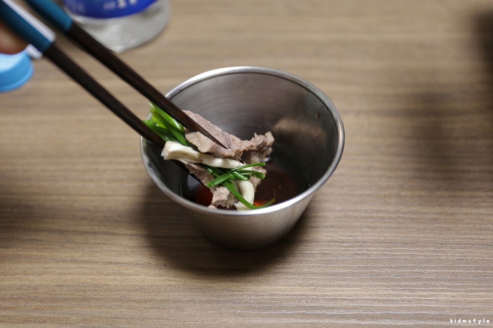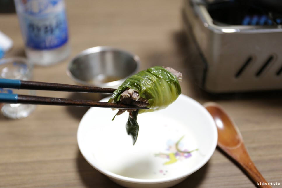 푹 익은 청경채를 고기에 싸서 맛있는 소스를 찍어서 맛본다. 글로 표현하기 힘든 맛이다.