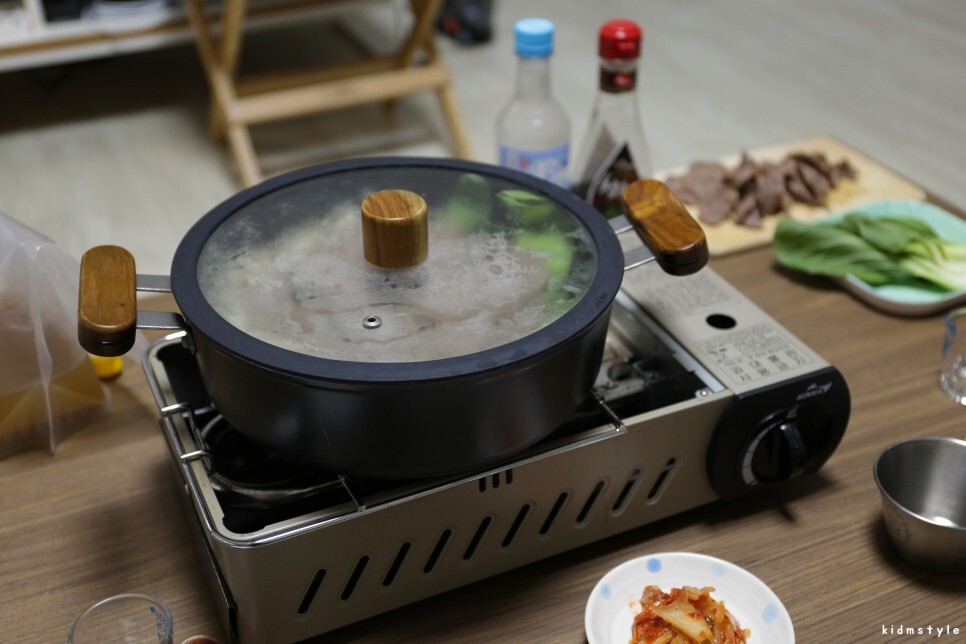 사진 좀 찍고 전골냄비 뚜껑을 닫고 열심히 끓여준다. 가스불~ 니가 뭐라고 그리 예쁘냐?