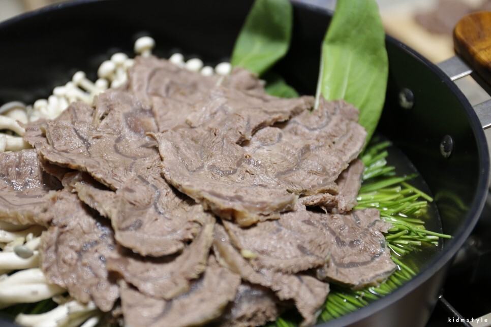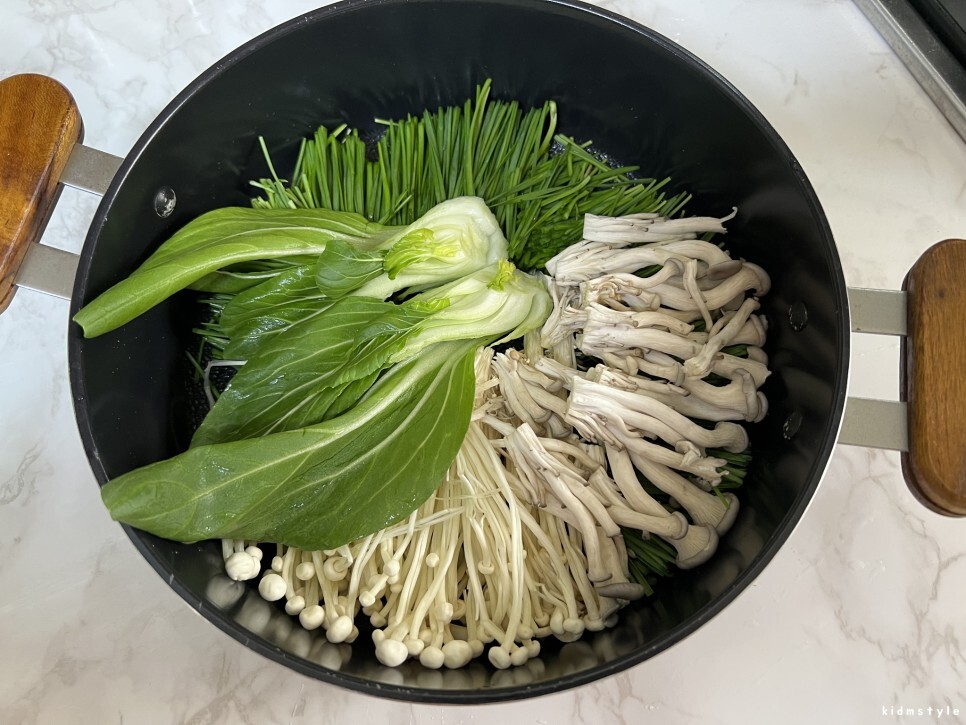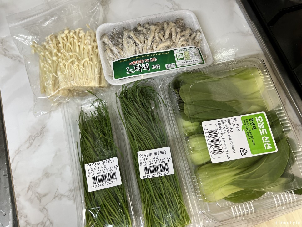 열심히 끓이는 동안 필요한 채소를 준비한다. 마트에서 장을 봐왔다고 한다. 팽이버섯, 느타리버섯, 부추, 청경채 등 취향껏 준비하면 된다. 부추는 2팩을 준비했는데 한 팩만 썼다. 참고로 가격이 더 비싼 영양부추 추천한다. 작고 야리야리하며 상당히 부드럽다.