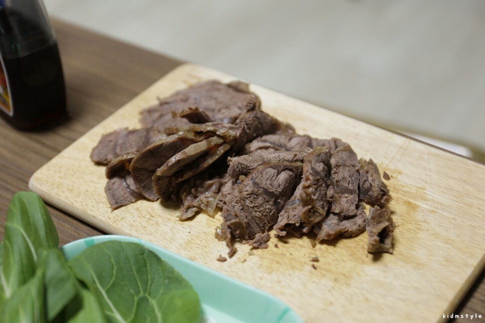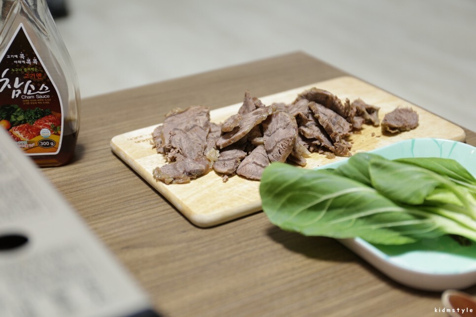여분으로 깔아놓은 아롱사태 수육과 청경채를 잠시 눈에 담고
