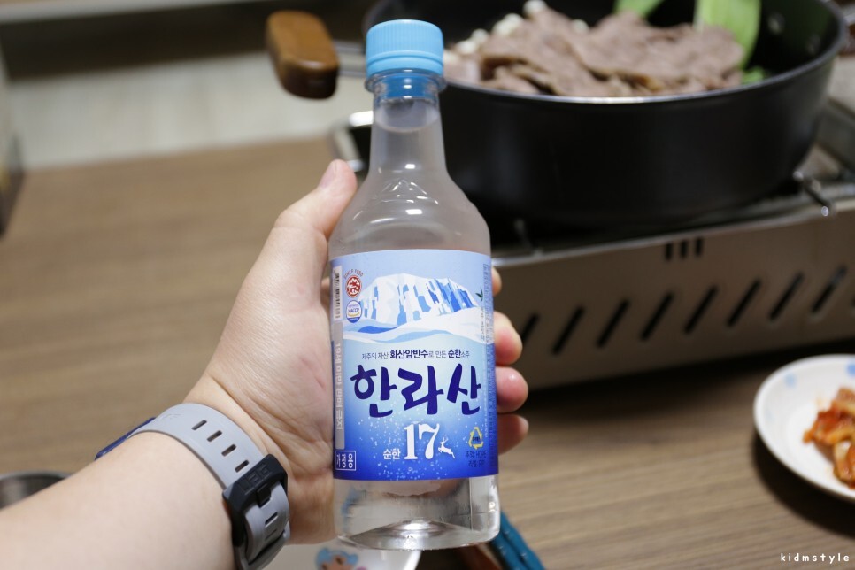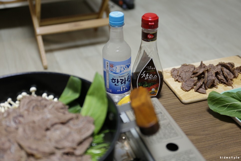 술이 빠질 수 있는가? 한라산 17도 준비, 그리고 고기에 빠질 수 없는 만능 소스 참소스까지. 고기를 조금이라도 즐긴다면 냉장고에 참소스 하나씩 구비해놓았을 것이다. 아 참, 한라산 17도는 이마트 노브랜드 매장에서 구할 수 있다. 페트라 아쉽지만 재활용 분리수거를 직접 하는 내 입장에는 페트가 훨씬 편하다.