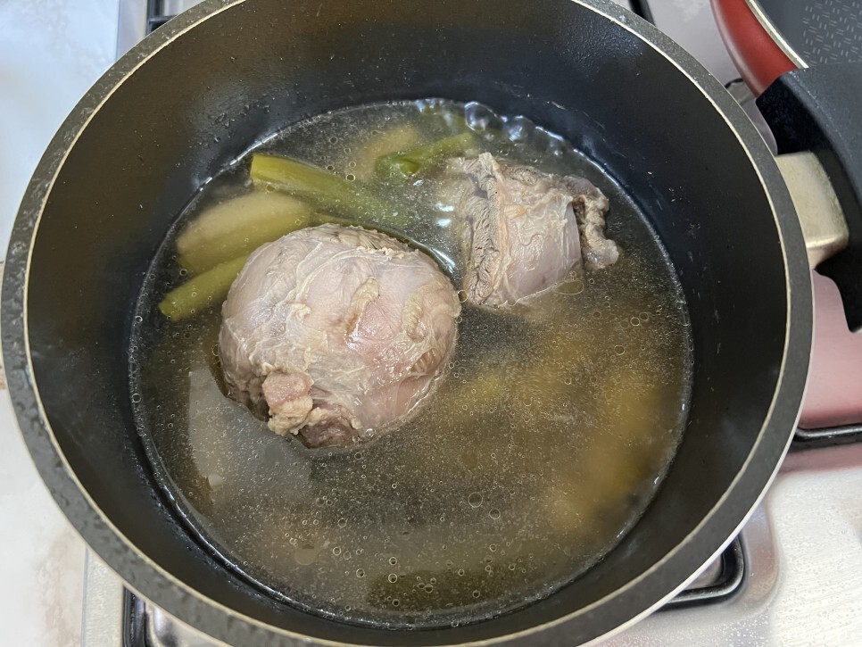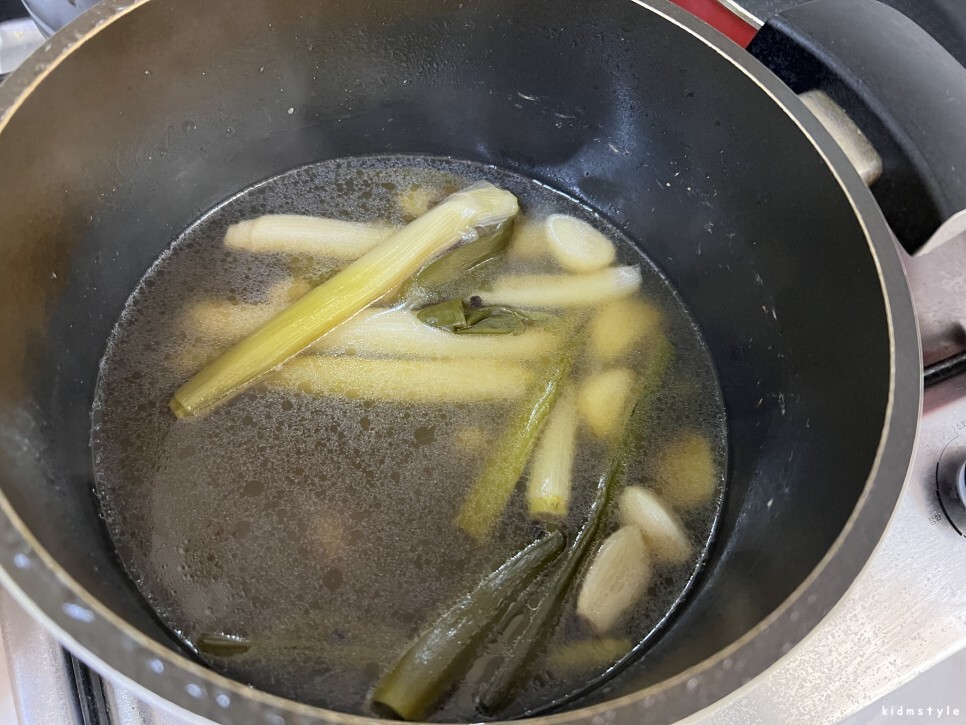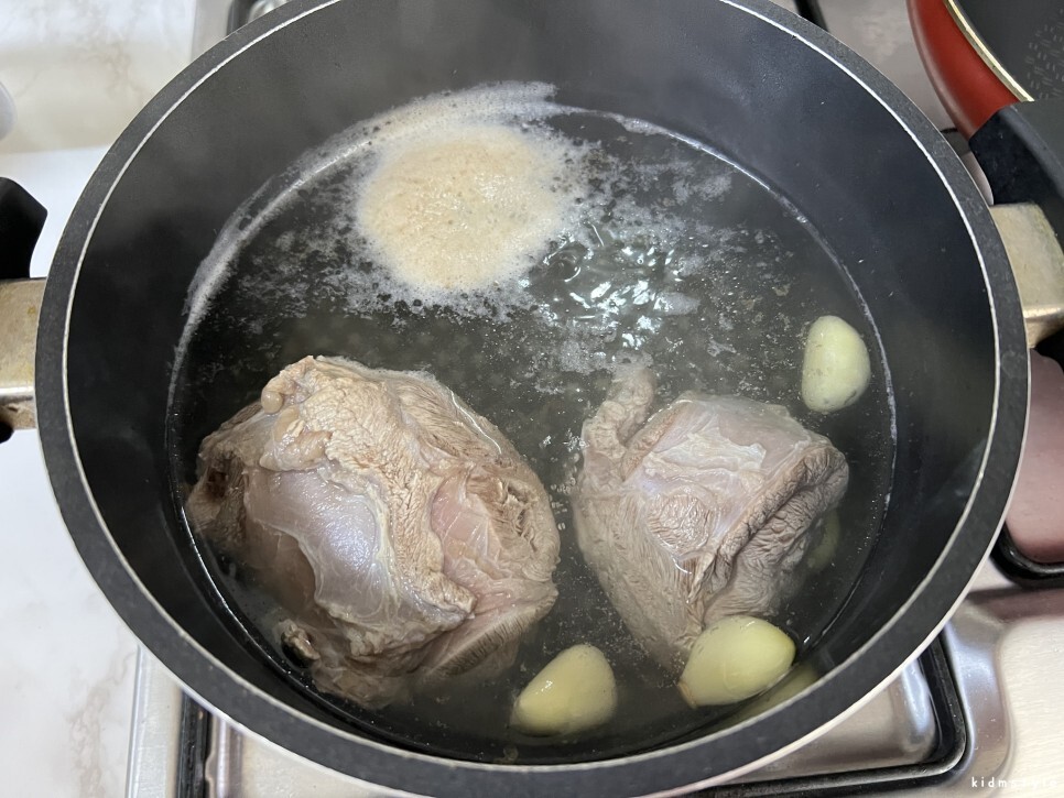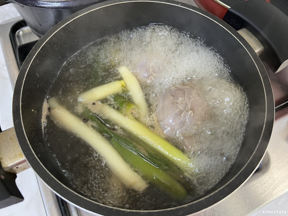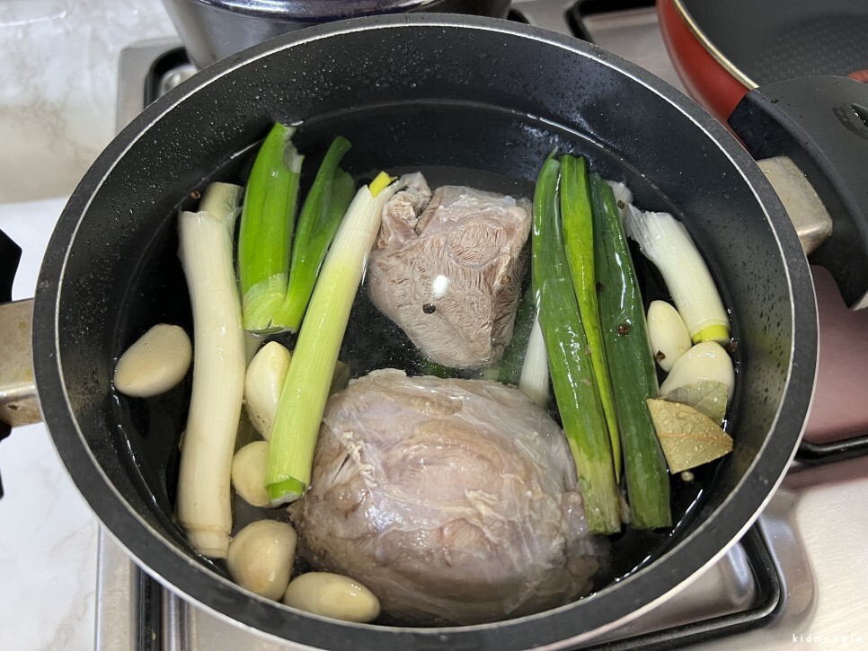 3. 대파, 월계수, 통후추, 통마늘 등을 넣고 1시간 30분 정도 끓인다.