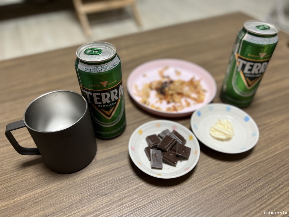 입가심은 맥주에 쥐포, 초콜릿으로 마무리.