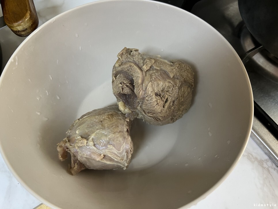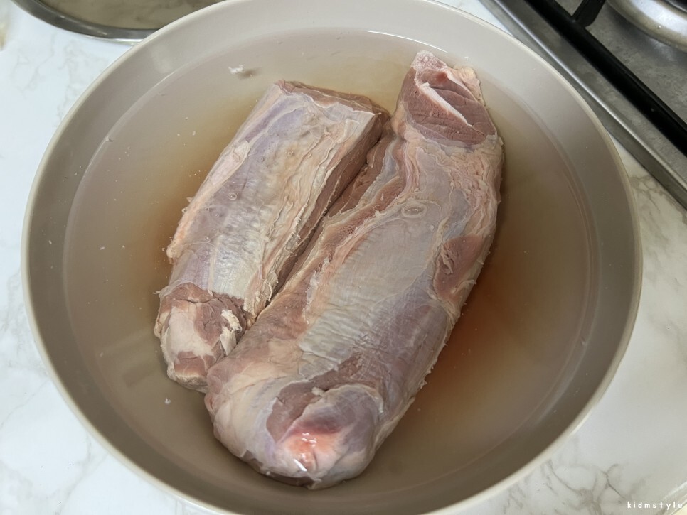오늘 처음 시도하는 본 요리는 시간이 꽤 걸린다고 한다. 왜냐하면 고기의 핏물을 빼고 한참을 끓이는 등 절차가 복잡하다. 하지만 어렵지는 않다. 인내가 필요할 뿐이다. 찬물에 아롱사태를 넣고 30분 정도 담가서 핏물을 빼준다. 모든 과정을 함께한 이가 진두지휘하는 중이다.