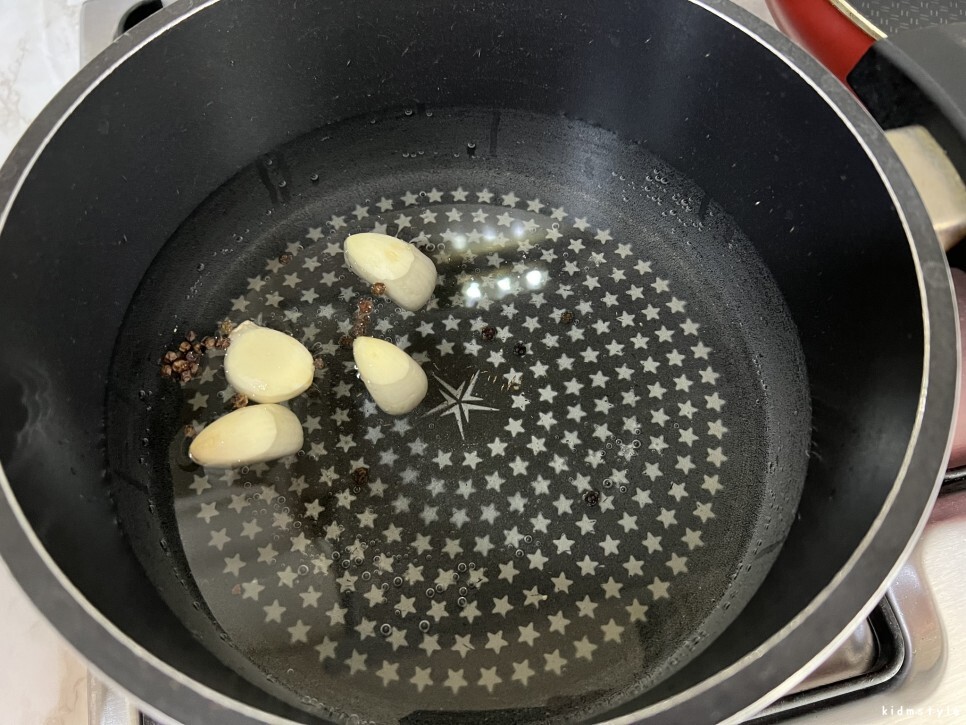 아롱사태의 핏물 거의 다 뺐다. 깨끗이 씻어준다. 냄비를 준비한다. 물을 적당히 넣고 통마늘, 통후추를 넣고 끓인다. 참고로 계량을 정확하게 할 필요 없다. 모자라면 더하고 넘치면 빼면 되는 게 요리의 기본 아닌가. 집 밥 요리계의 대통령, 백종원 님의 말씀.