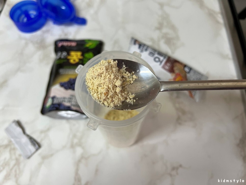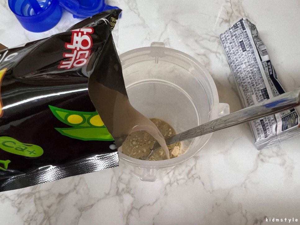 본격적으로 맛본다. 물과 우유, 두유 등 뭐든 괜찮은데 필자는 우유보다는 두유를 좋아하므로 두유로 준비한다.