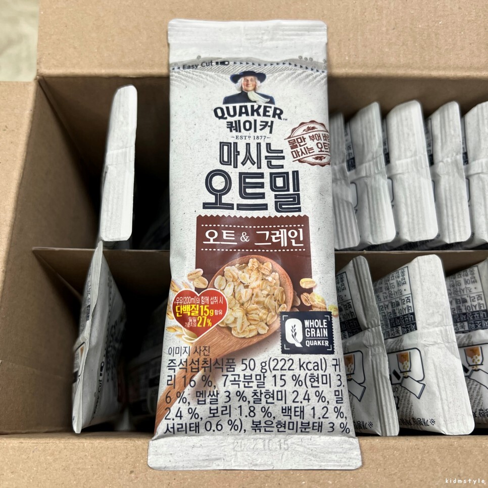 바쁜 아침, 간편하게 맛볼 수 있는 한 끼를 추천해 본다. 요즘 유행하는 곡물 퀘이커이다. 다양한 제품을 맛보고 있는데 하나하나 소개해 보려고 한다. 오늘 소개할 제품은 롯데 퀘이커 마시는 오트밀이다. 몇 가지 맛이 있는데 내가 주문한 맛은 오트&그레인 맛이다.