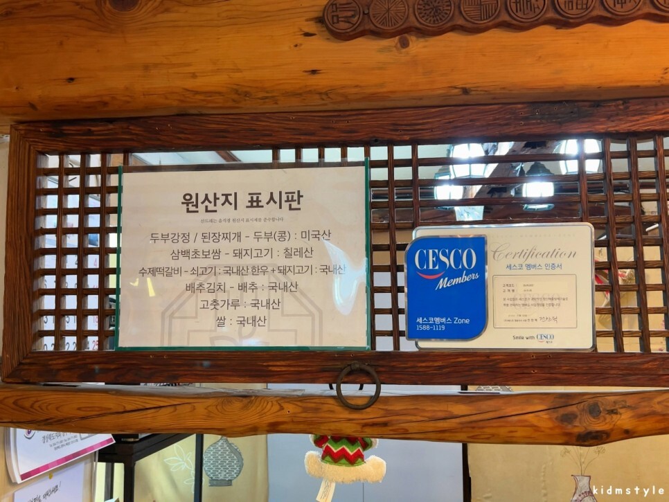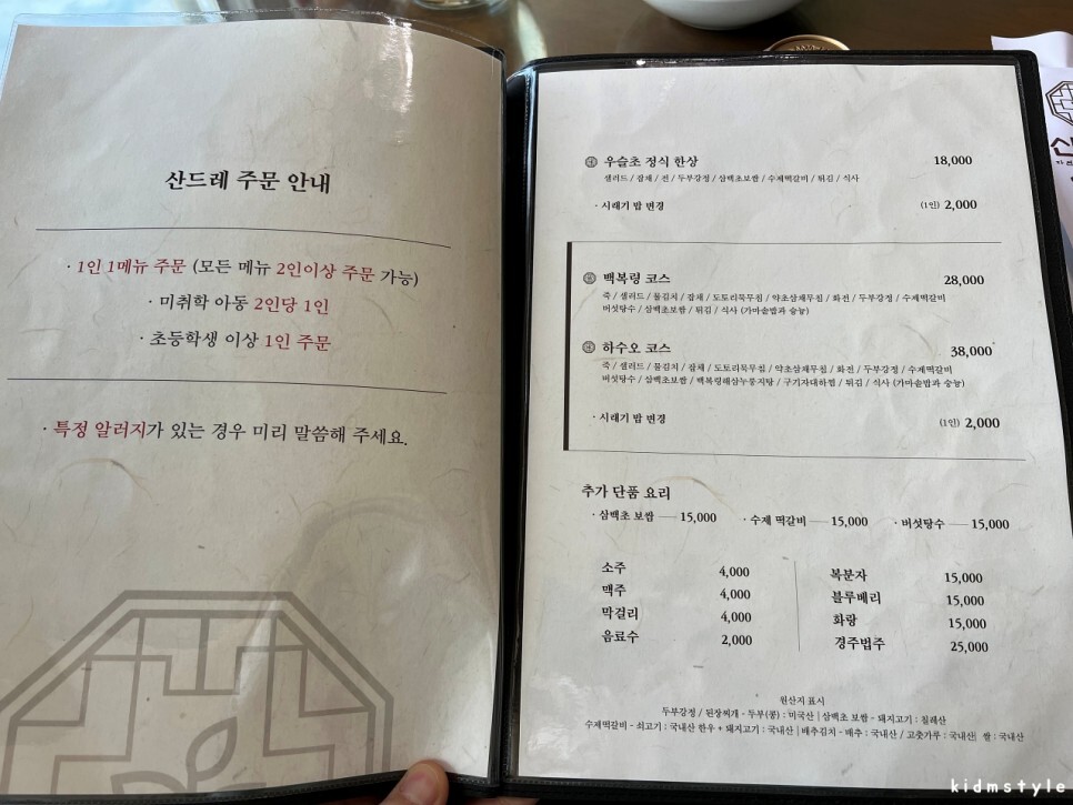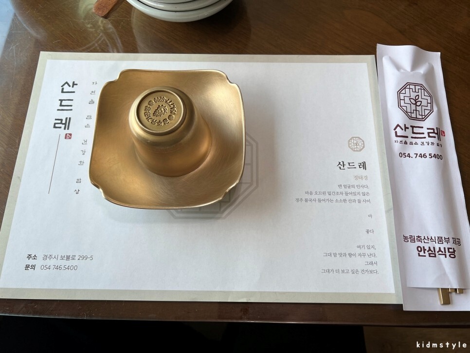 앞접시와 물 잔이 깔린다. 방짜 유기그릇이다. 산드레, 찾아보니 경주에서 꽤 유명한 한정식 식당이다. 수저는 종이봉투에 잘 담아져 있다. 농림축산식품부 지정 안심식당이다.