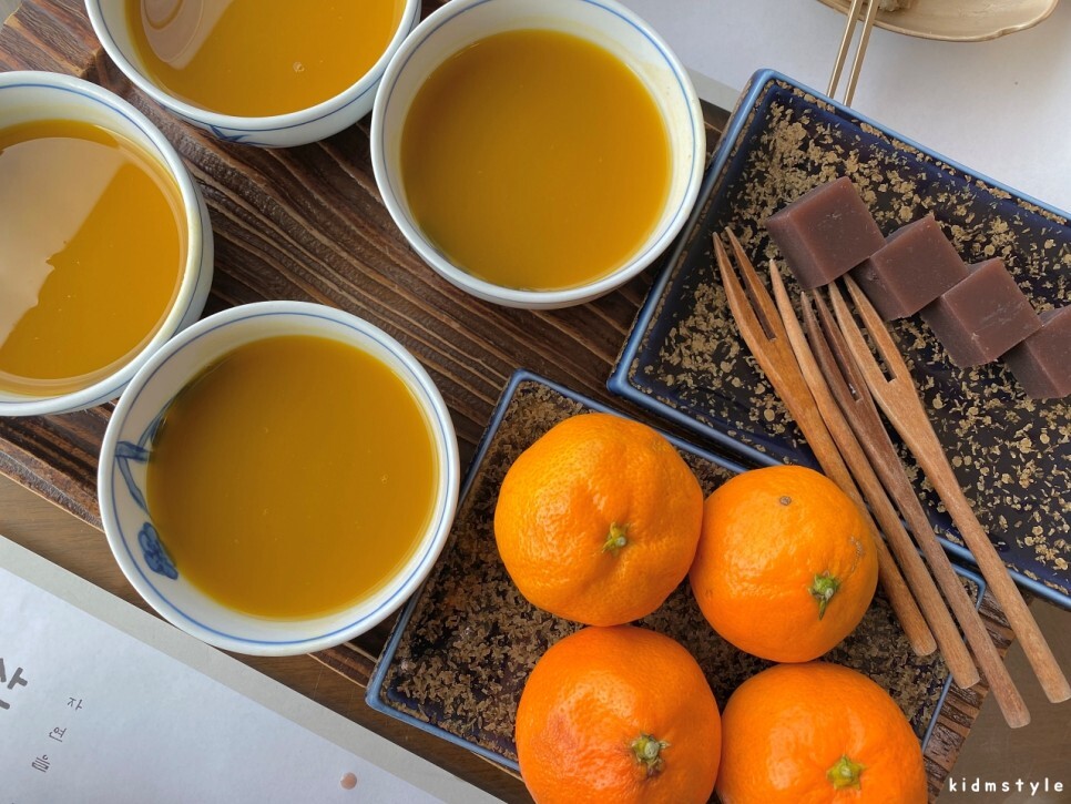식사를 마칠 때쯤 후식이 제공된다. 호박식혜, 귤, 양갱이다. 호불호가 안 갈리는 후식이다. 아 참, 적어도 내 입에는 말이다.