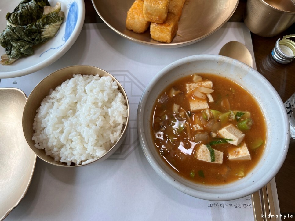 된장찌개를 앞접시에 덜고 본격적으로 맛본다. 된장은 차분하면서도 깊은 맛을 준다. 간이 세지 않으면서 그 맛을 유지하는 이런 된장찌개 참 맛이 좋다. 숟가락으로 퍼먹어도 짠맛을 느끼지 않고 기분 좋게 맛볼 수 있는 찌개라 밥과 참 어울린다.
