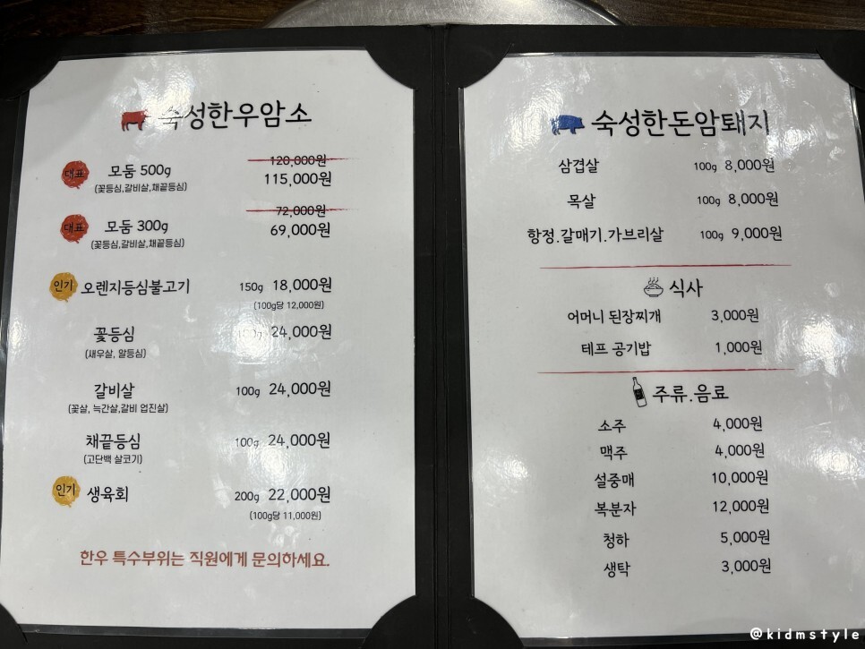 메뉴판을 찍어본다. 전반적으로 가격이 합리적이다. 가성비가 좋아 보인다. 그 이유는 중매인과 직접 연결하여 중간 유통 마진을 최소화하였고 더 신선하고 육질이 좋은 한우, 한돈을 판매한다고 한다.