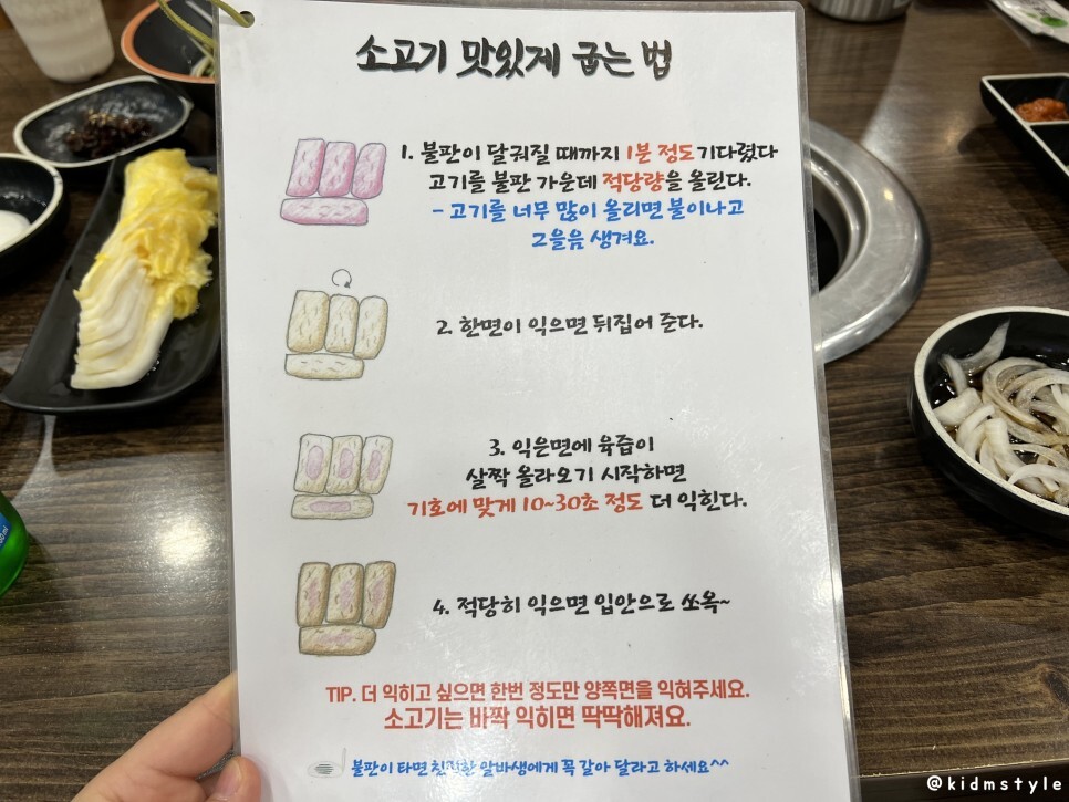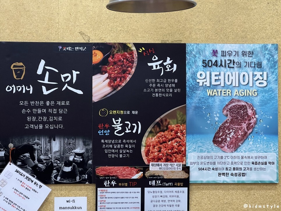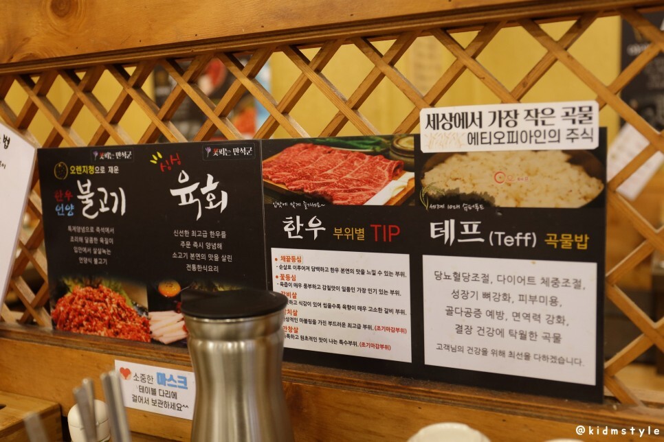테이블 옆에 이런저런 안내가 붙어있다. 언양 불고기, 육회가 이 집의 별미이다. 참고로 육회는 당일 신선한 재료를 준비해서 주문 즉시 제공되므로 금세 재고가 소진된다. 몸에 좋은 테프 곡물밥도 한번 맛보고 싶다.