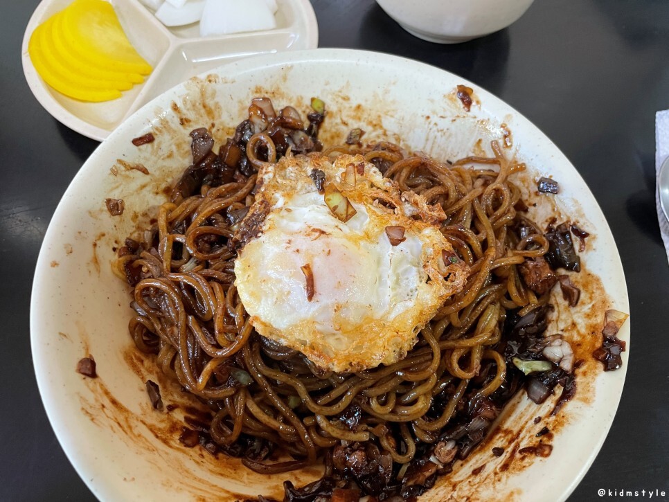 여기는 부산이다. 간짜장에 튀긴 계란후라이가 올라간다. 이게 없으면 안 된다. 투박한 듯 썰어놓은 오이가 우스꽝스럽다.
