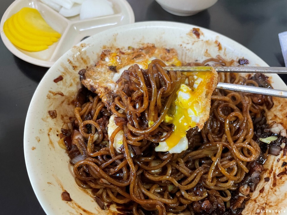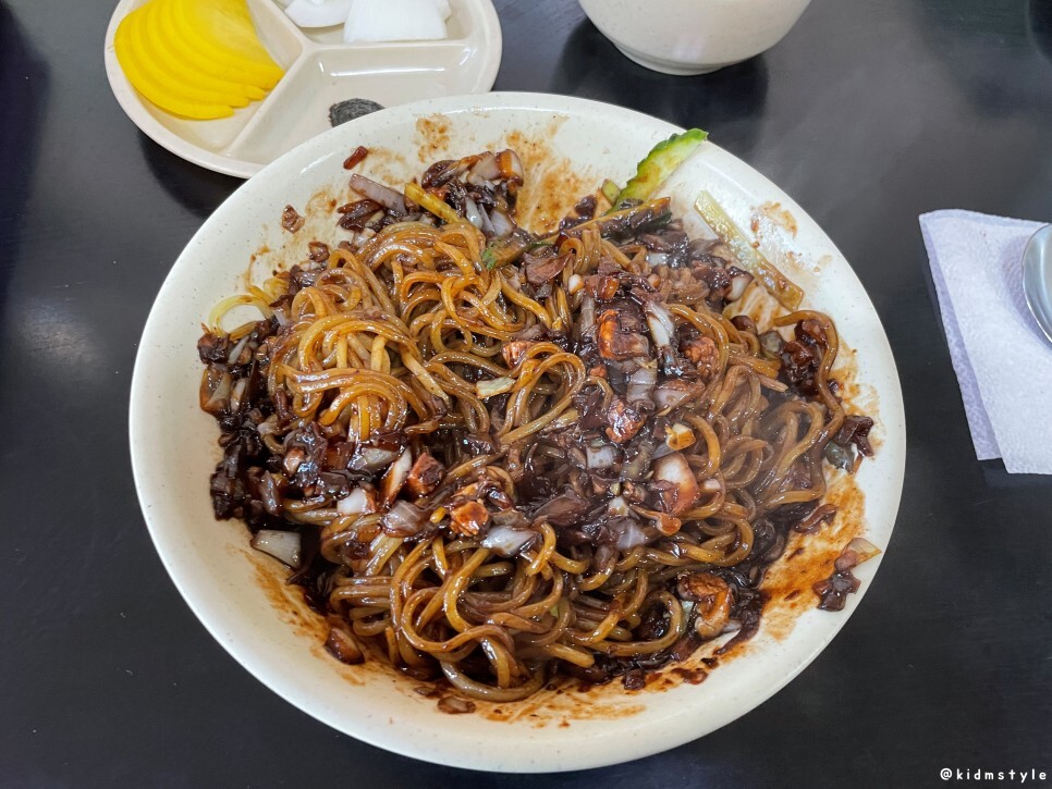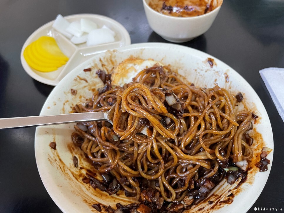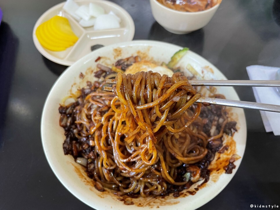 그리고 한 젓가락 맛본다. 고소함이 가득한 딱 옛날 짜장이다. 역시 짜장면은 식당에서 바로 먹는 것이 참 좋다. 면발이 쫄깃한 게 제대로 만든 짜장면이다.