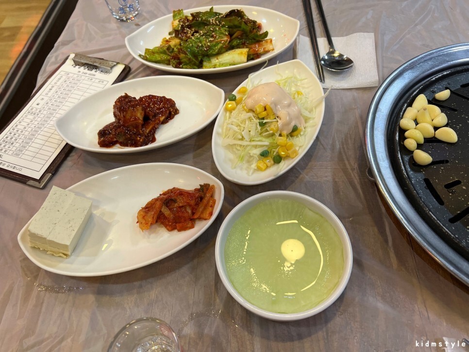 기본 반찬이다. 봄동 겉절이, 양념게장, 양배추 샐러드, 두부김치, 쌈무, 오른쪽에 보이지는 않지만 동치미도 있다. 양곱창을 굽는 동안 양념게장이나 두부에 한잔하기 좋다.