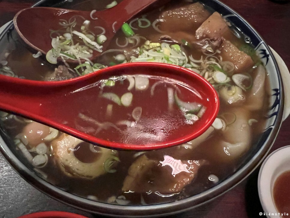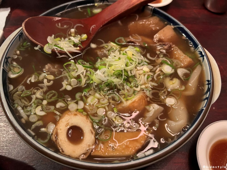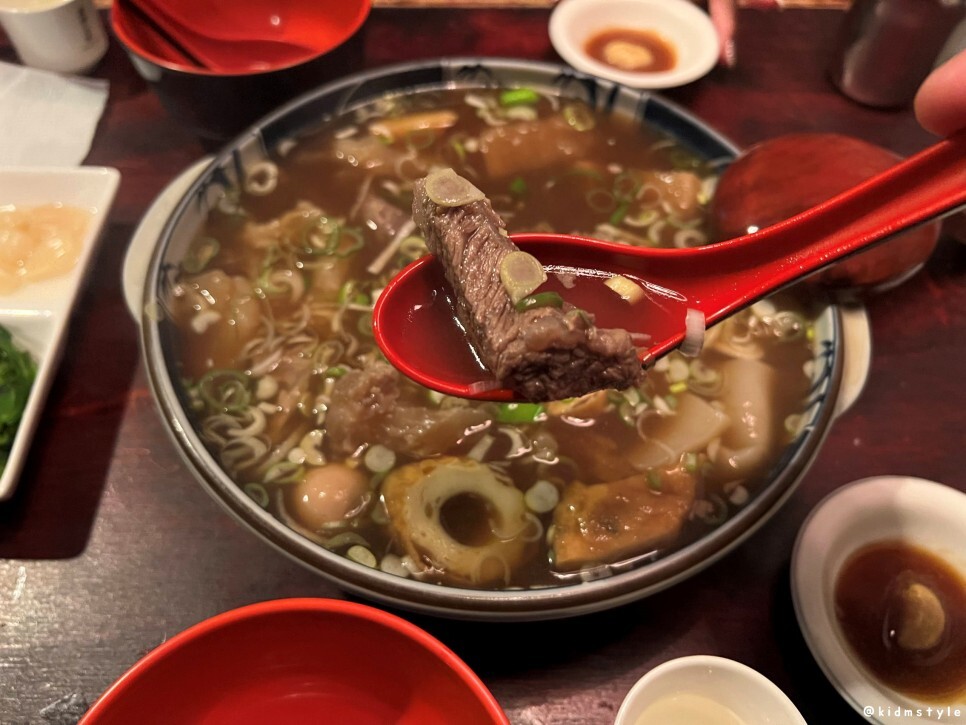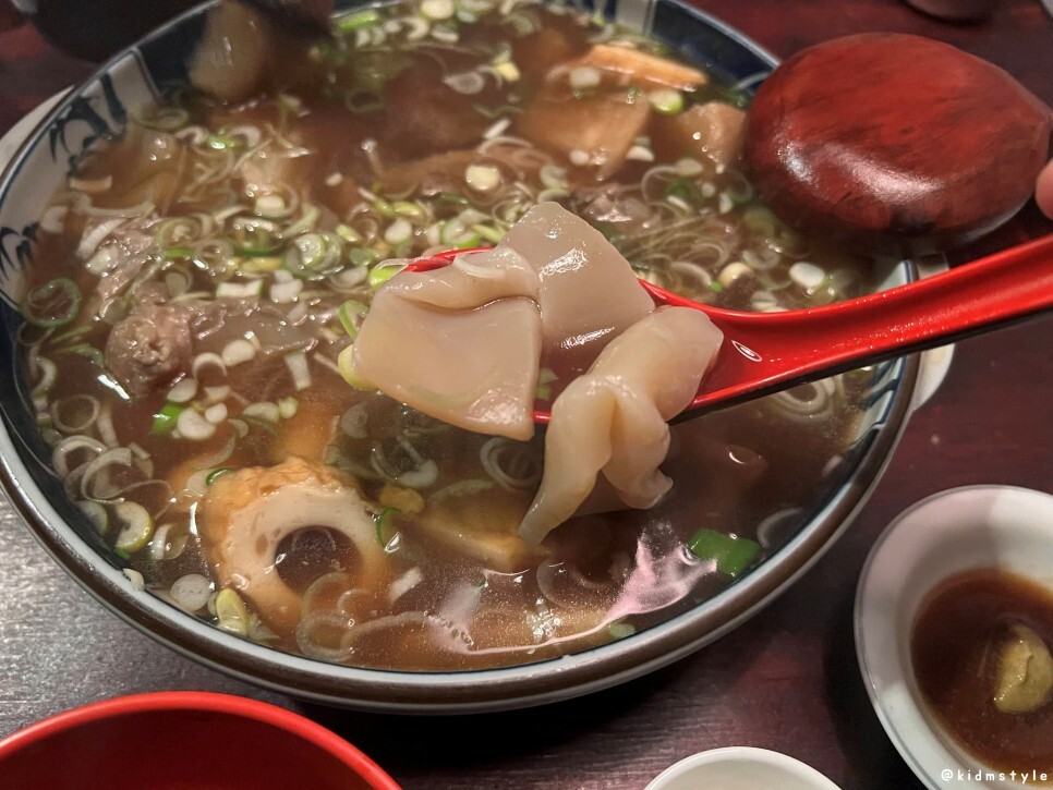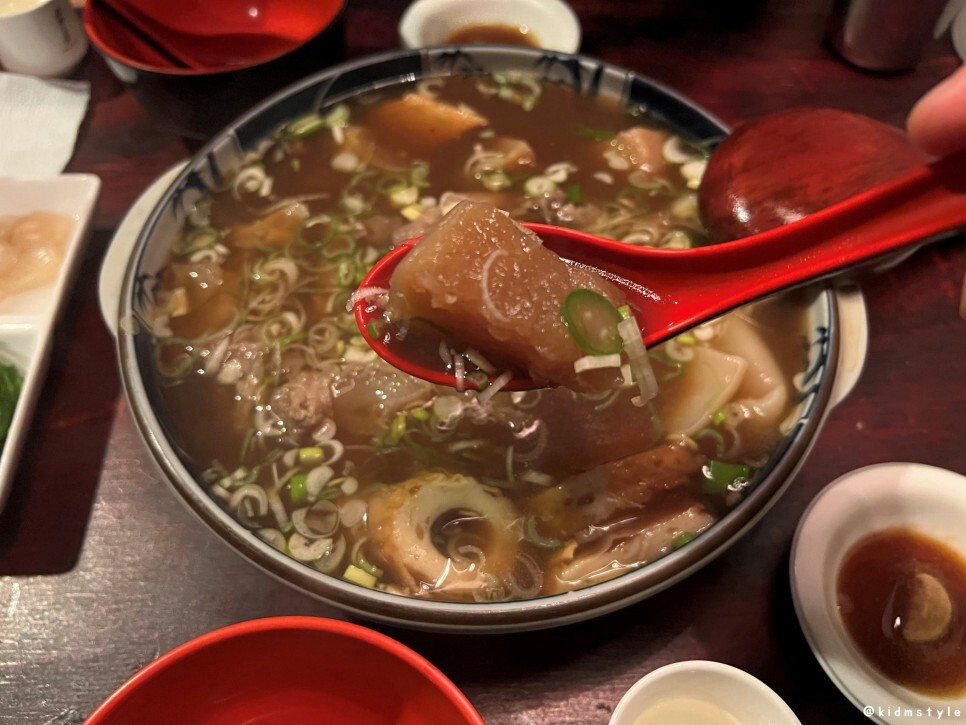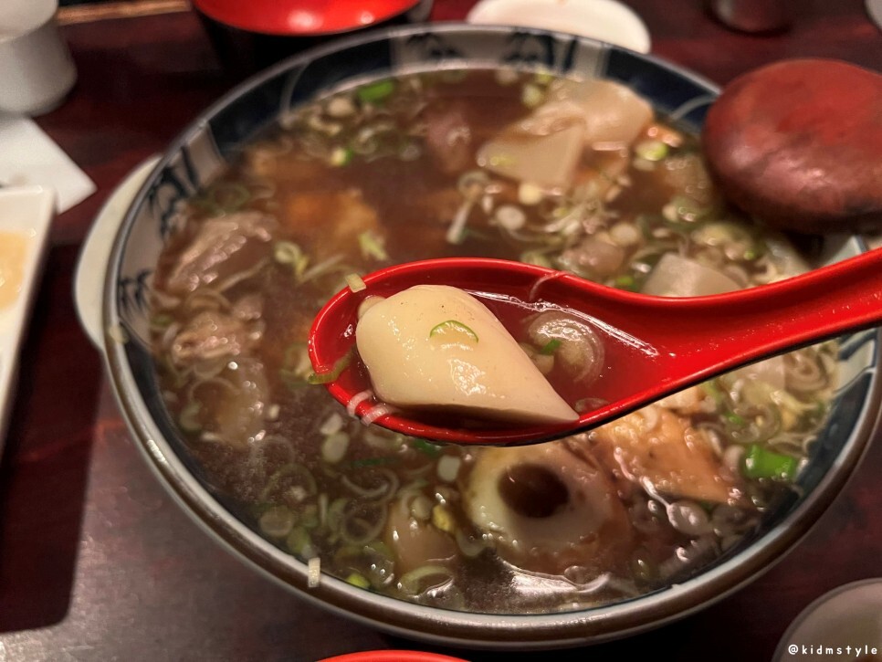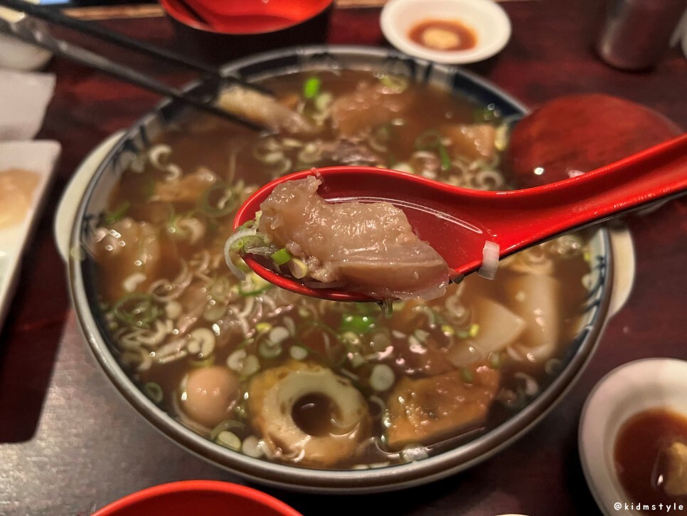 스지가 많이 들어가 있다. 부드럽고 물컹한 식감이 참 매력적이다. 스지 못 먹는 사람이 꽤 있던데 맛 들이면 참 맛있다.