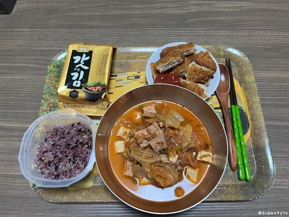 간단하게 저녁을 차려보았다. 미리 끓여둔 김치찌개와 김이 반찬이고 밥은 냉동해두었던 잡곡밥을 해동했다.