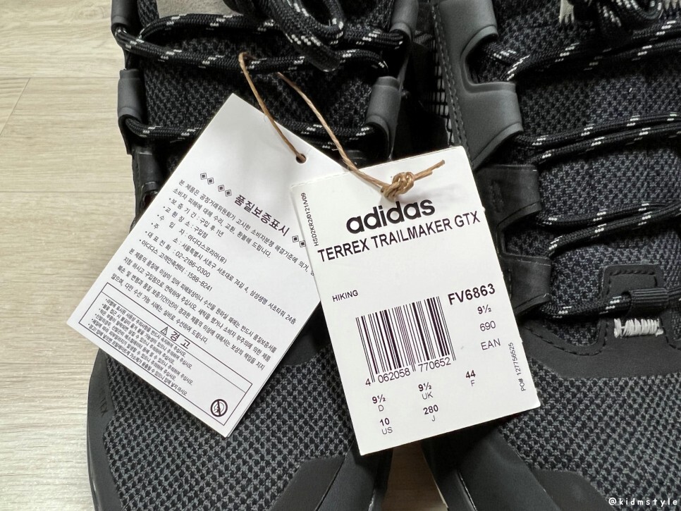 주문한 아디다스 테렉스 트레일메이커 고어텍스 제품이다. 모델명은 FV6863이다. 테렉스 제품이 발볼도 좁게 나오고 전반적으로 타이트하게 나온다는 후기를 참고하여 평소 신는 아디다스 제품보다 5mm 업해서 구입을 하였다.