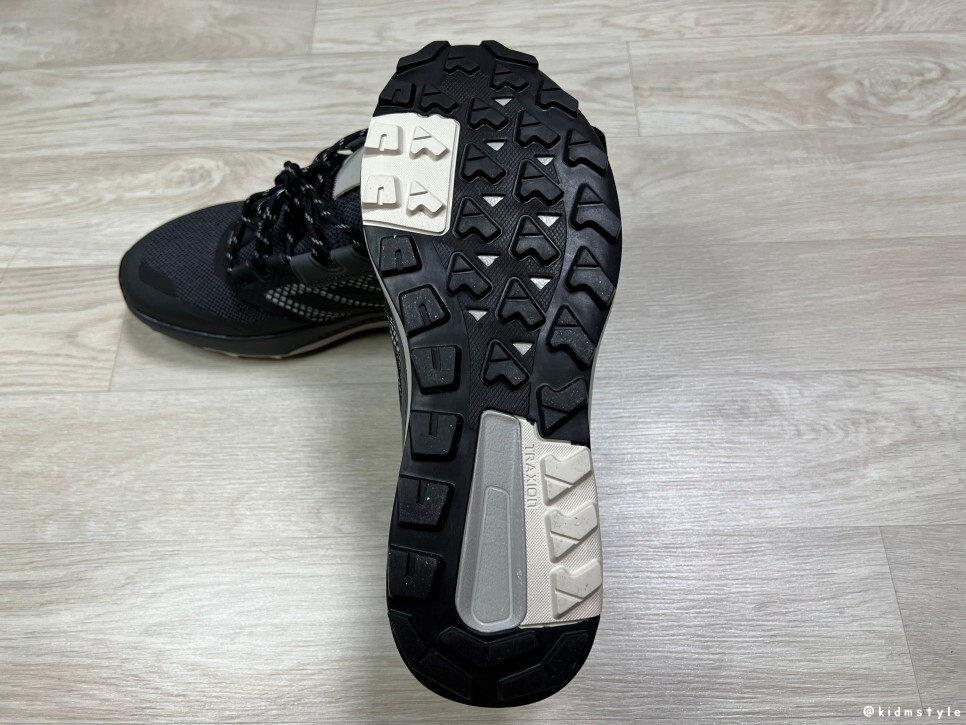 신발 바닥은 traxion 트랙션 밑창이다. 울트라부스트 등 최근 아디다스에서 밀고 있는 컨티넨탈 밑창 대비 어떤 경험을 제공해 줄지 궁금하다. 결론을 말하면 컨티넨탈 못지않게 미끄러움에 강한 바닥이더라. 빗길에도 전혀 문제없다.