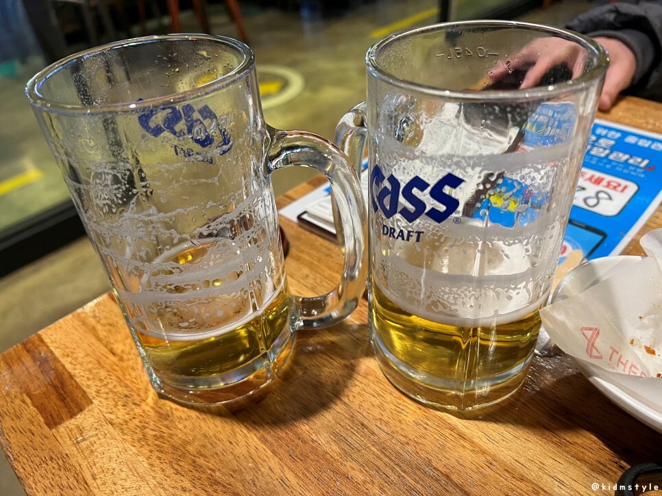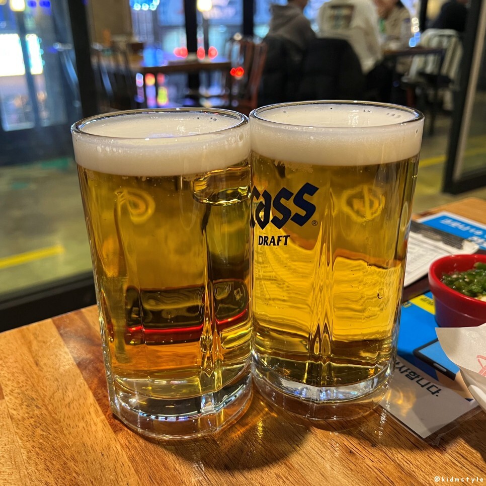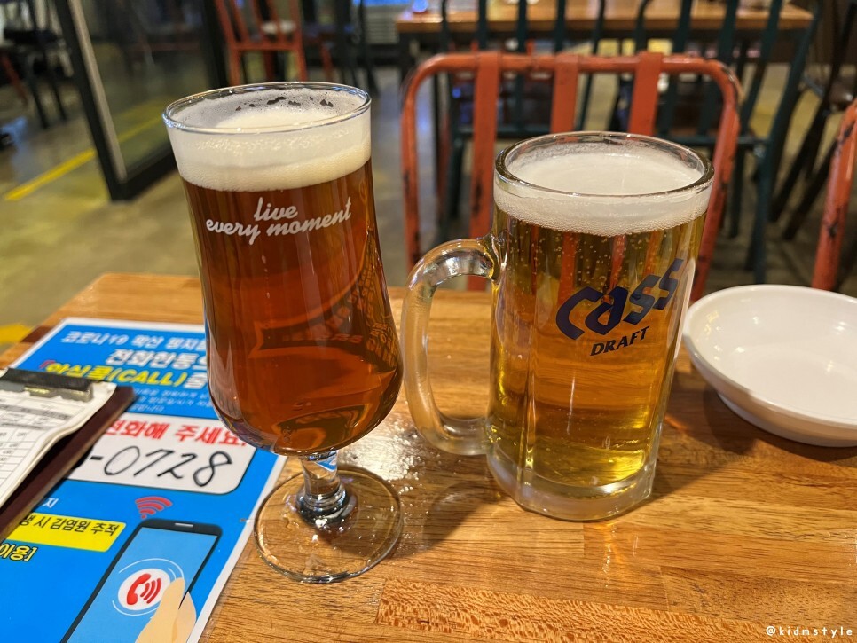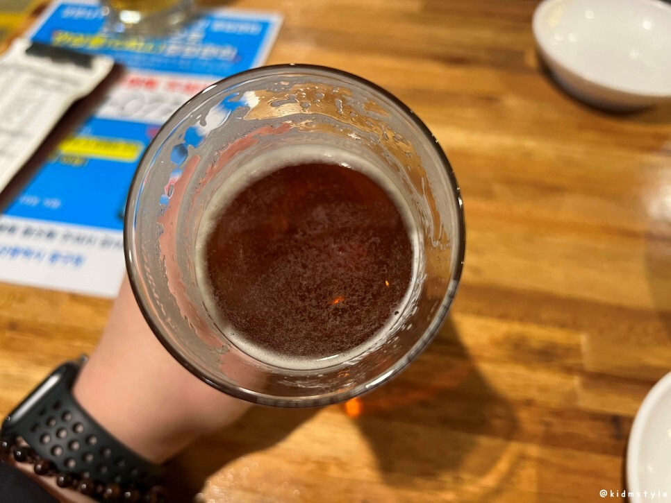 열심히 맥주를 마신다. 2잔째 주문. 함께한 이와 맥주 한 모금의 차이는 이렇더라. 내가 마신 게 왼쪽 잔이다. 나는 자주 마시는 반면, 상대는 한 모금이 크다. 어쨌든 먹는 양은 같다.