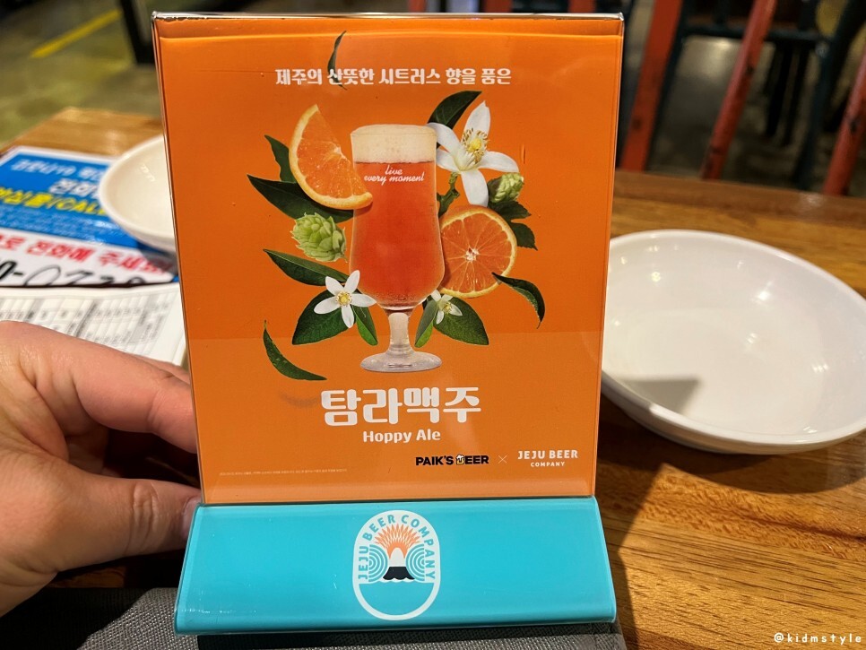 신 메뉴가 나왔네? 이름은 탐라맥주이다. 제주의 산뜻한 시트러스 향을 품은 맥주. 평소 즐겨마시는 제주 위트에일의 제주 맥주와 콜라보 한 맥주라 기대가 된다. 한 잔 주문해 본다.