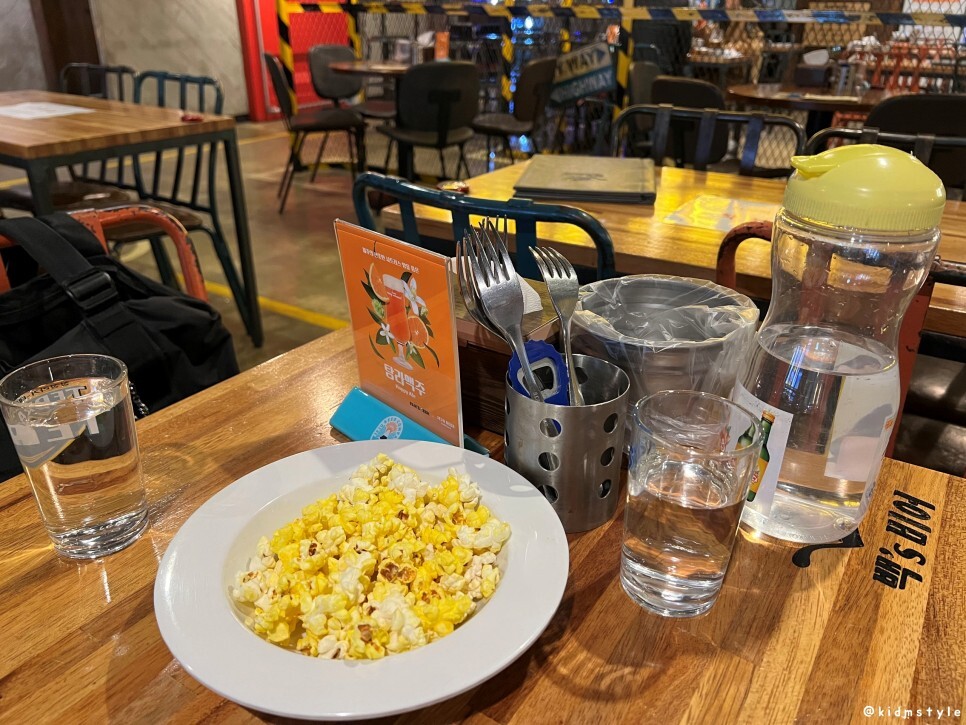 주문한 안주가 나오기 전에 팝콘으로 맥주 한 잔은 거뜬히 마실 수 있다. 모자라면 더 요청하면 된다.