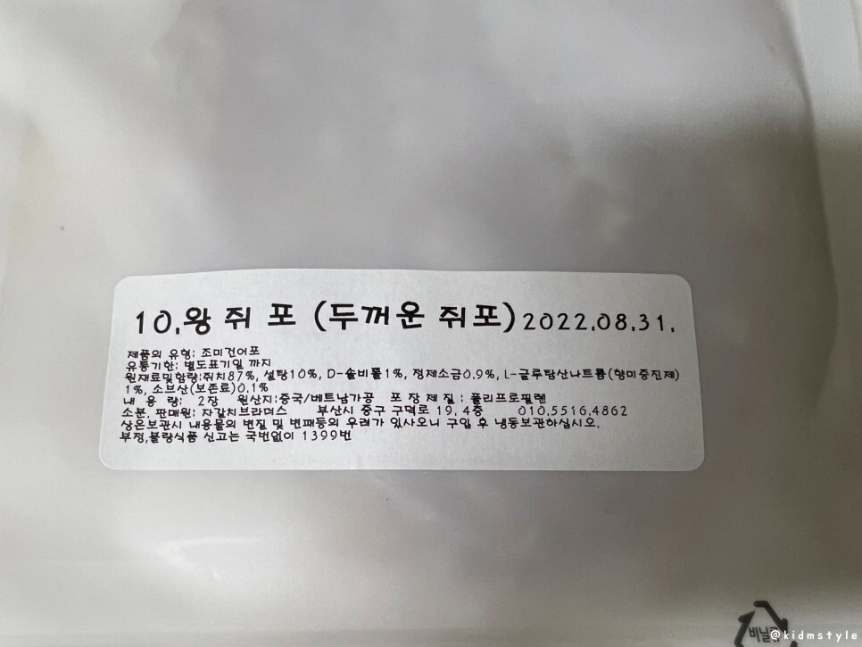 먼저 쥐포의 원재료 등 정보 참고